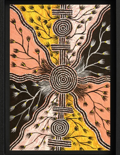 « Yala at Yantjupu » 37×55 cm – 1973 Provenance: Papunya Tula Artists, Acquired by the woodwork teacher at Papunya School in 1973, Important Aboriginal Art, Sotheby’s, Melbourne 1998, Spinifex & Sand, Mossgreen, The Tony Norton & Jann Williams Collection, Tasmania, Aborigène Galerie Collection, Paris, France