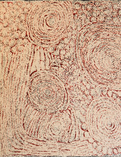 Elle mixe habillement les motifs traditionnels et ceux symbolisant les régions où se déroulèrent les exploits de cette Ancêtre du Temps du Rêve : on y distingue ici un point d’eau permanent, ici une grotte, ici un site argileux.