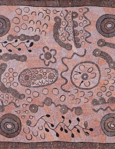 Ses peintures représentent généralement des dessins associés au trou de roche et au site d’eau de Marrapinti, à l’ouest de la communauté de Kiwirrkura en Australie occidentale. Les lignes de ce travail représentent les grands “tali” (collines de sable) qui entourent Marrapinti et les proches “puli” (collines rocheuses). À l’époque ancestrale, un grand groupe de femmes se rassemblait sur ce site lors de leurs voyages vers l’est.