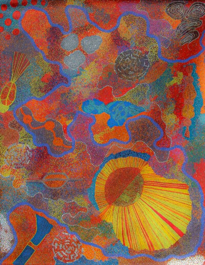 En 1994, Barbara fait partie du petit groupe d’artistes d’Utopia qui traverse l’Indonésie pour apprendre d’avantage sur les techniques du batik. Rappelons que le mouvement artistique à Utopia est né en 1977 de la création de batiks. La peinture sur toile ne voyant le jour qu’une dizaine d’années plus tard. De ce voyage naît de nouvelles idées. Barbara développe alors un style plus personnel.