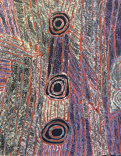 Au cours de leurs voyages, les hommes et les femmes ont rassemblé une variété d’aliments du bush, notamment des tomates pura ou des tomates du bush (Solanum chippendalei) et du kampurarrpa ou des raisins secs du désert (Solanum centrale). Ils ont également ramassé du bois pour la fabrication de wana (bâtons à creuser). Les cocardes dans l’œuvre représentent les eaux de trempage trouvées sur ce site.