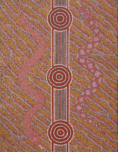 Elle montre son pays et les sites sacrés de Rrpwamper (opossum), Anek (igname), Rwang (feu), Lhwelk (lézard à langue bleue), Atwern (soleil), Atay (lune), Morning Star et autres Tjukurrpa.
